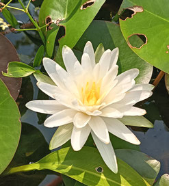 8月24日に白い睡蓮が咲きました。白い睡蓮は初めてです。かなり前に睡蓮の株を買ってから今年まで花を咲かせせることがなかったので本当にうれしいです。今年は用意していた睡蓮鉢の全部に花を見ることができました。白い睡蓮は、その純粋な白色から、清らかで純粋なイメージを連想させます。モネの白い睡蓮の絵がすきなので、来年以降もこの株を大切にしようと思います。